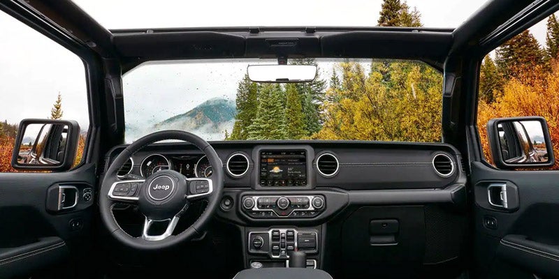 Interior features on the Moab trim include premium leather upholstery, an 8.4-inch touch screen, navigation, a premium nine-speaker Alpine audio system, and an auto-dimming rearview mirror. The top Rubicon has upgraded cloth upholstery. Optional features are available on different trim levels, such as heated seats, a heated steering wheel, a high-quality soft-top, the Alpine audio system, and remote start.