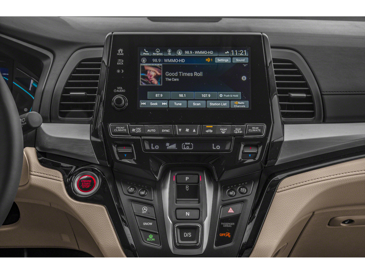 - Radio: 550-Watt AM/FM/HD Premium Audio System -inc: 10 speakers, subwoofer, SiriusXM satellite radio, multi-zone audio, Honda satellite-linked navigation system w/voice recognition and Honda HD digital traffic, Bluetooth® HandsFreeLink, Bluetooth® streaming audio, MP3/auxiliary input jack, radio data system (RDS), SMS text message function, 2.5-amp USB audio interface port in front, 2.5-amp USB charging port in center console, 2 2.5-amp USB charging ports in second row, CabinControl remote compatibility, 8" display audio w/high-resolution (720P) electrostatic touch-screen and customizable feature settings, Apple CarPlay/Android Auto, mobile hotspot capability, wireless phone charger, illuminated steering wheel-mounted audio and navigation controls and body-colored fin-type roof-mounted antenna